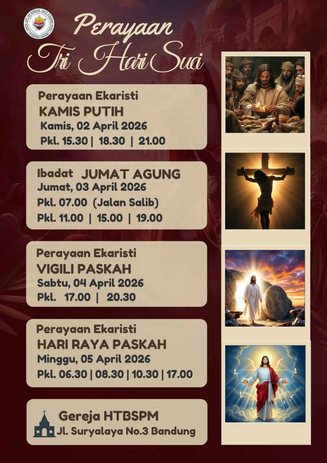 Apr 26 | Misa Hari Minggu Paskah IV Sabtu (25/4) Pk 17.00, Minggu Pk 06.30, 08.30, 10.30, dan 17.00 |
