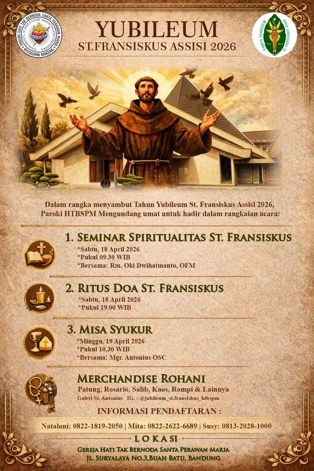Apr 19 | Misa Hari Minggu Paskah III Sabtu (18/4) Pk 17.00, Minggu Pk 06.30, 08.30, 10.30 (Misa Syukur Yubileum St. Fransiskus), dan 17.00 |